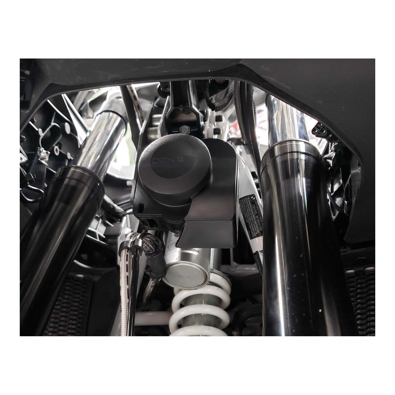 This vehicle-specific split horn mount allows you to mount the DENALI SoundBomb Split Dual-Tone Air Hor in the optimum location on your BMW R 1250 GS/GSA. This kit includes one powder-coated steel bracket to mount the horn compressor behind the cylinder head and a second bracket to mount the horn acoustic unit centered under the fairing stay.